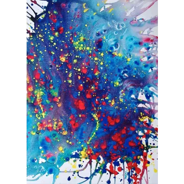This abstract acrylic painting, "Questions of the Universe," is a vibrant exploration of color, texture, and cosmic wonder. Swirls of red, blue, gold, and white dance across a dark background, evoking the grandeur of the universe and its endless mysteries. The textured brushstrokes and dynamic patterns pull viewers into a captivating visual journey, sparking curiosity and imagination. This artwork pays homage to the infinite questions about life and existence that the universe inspires within us.