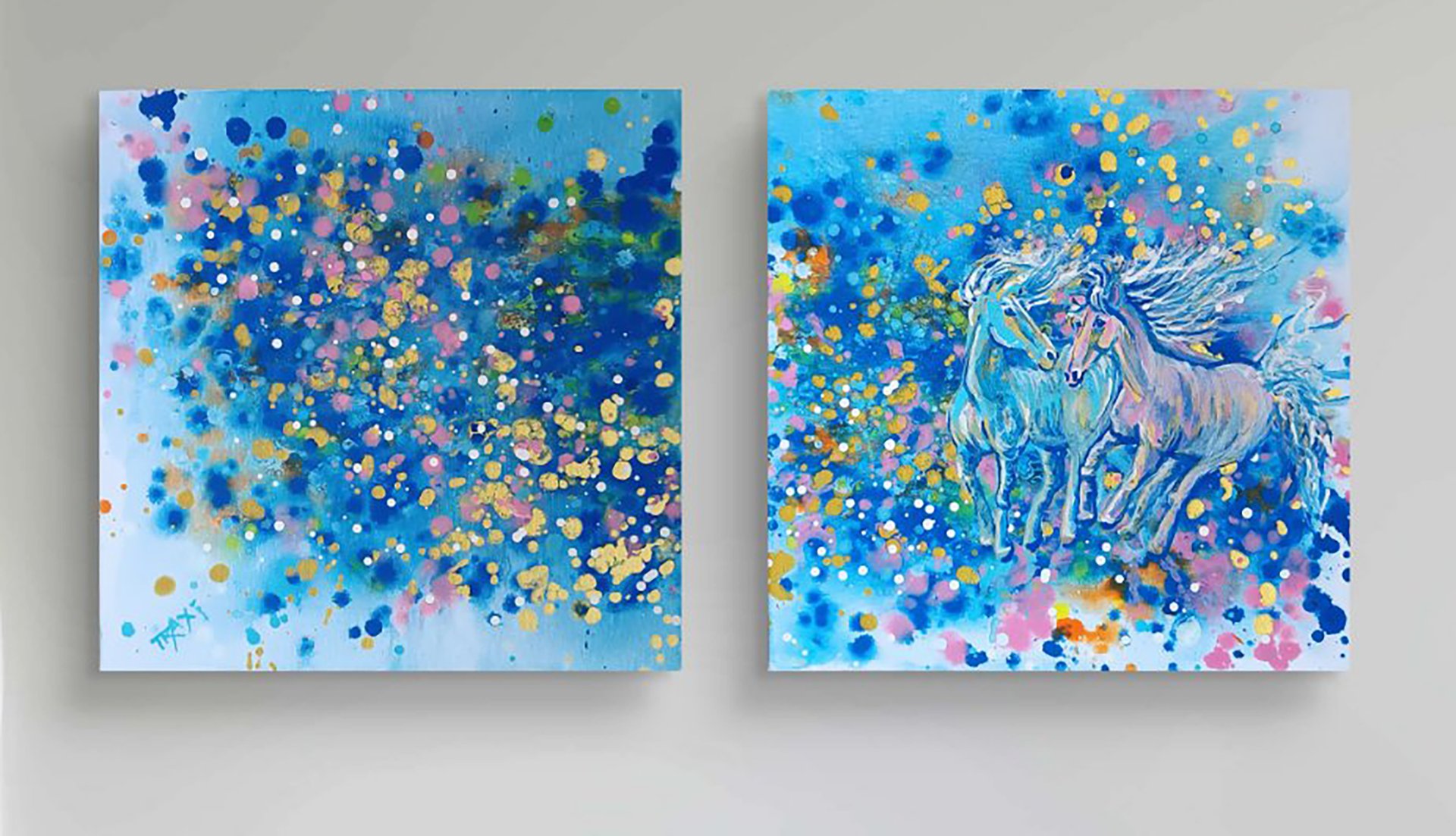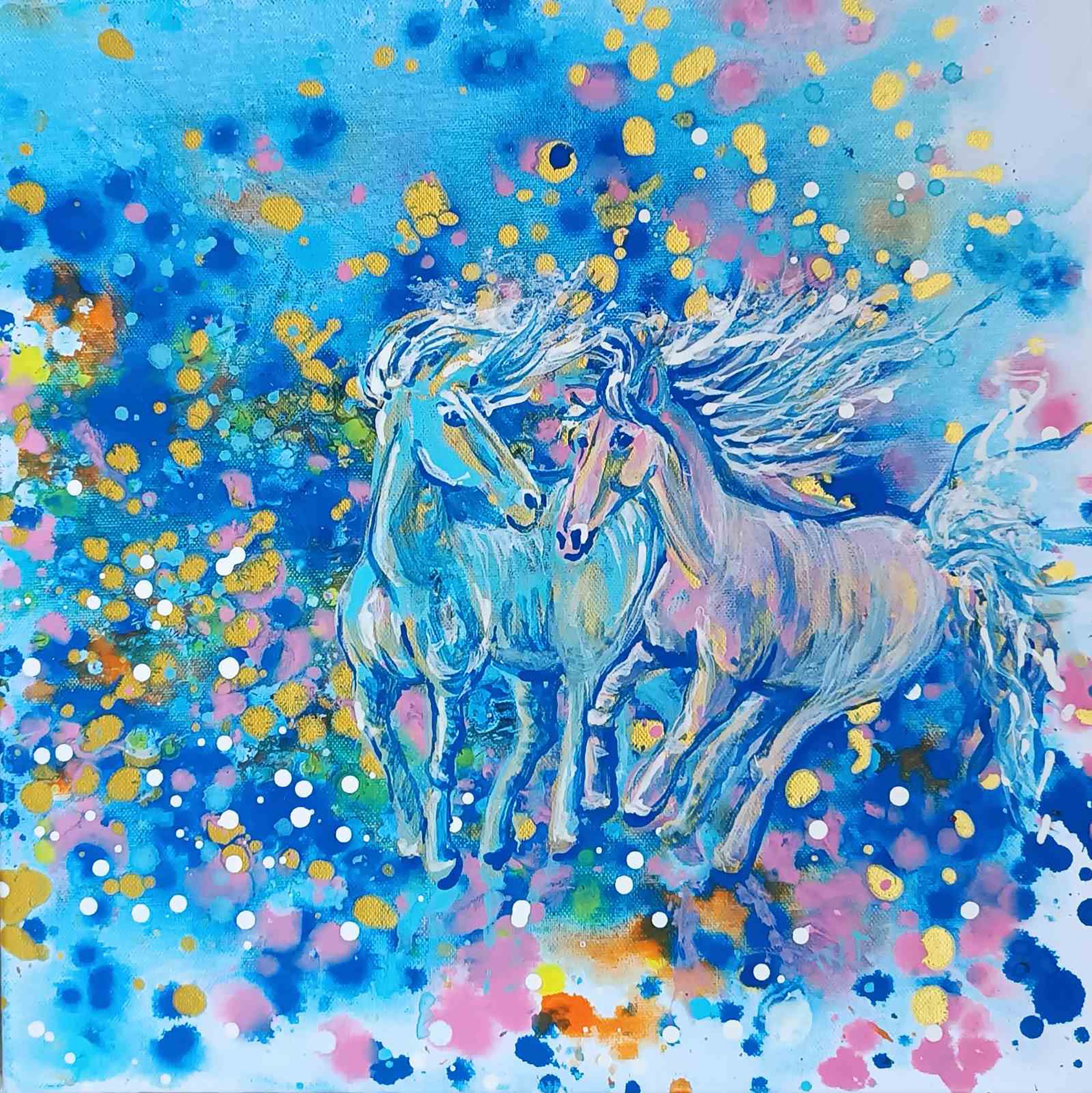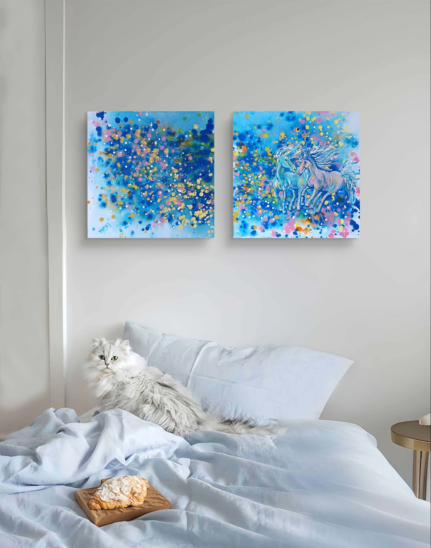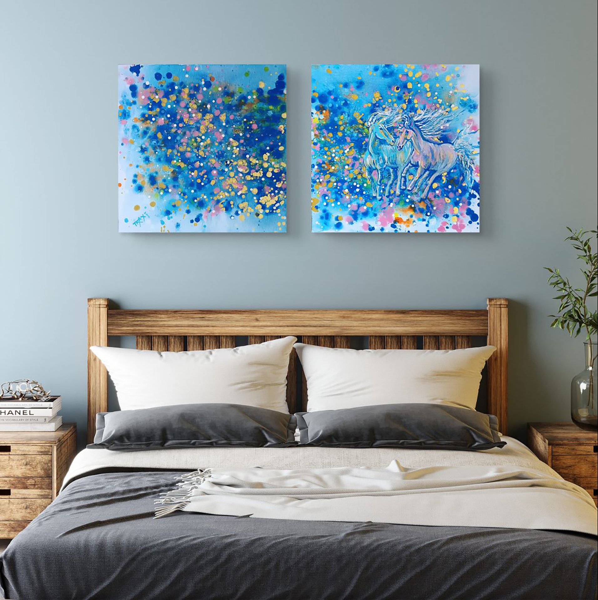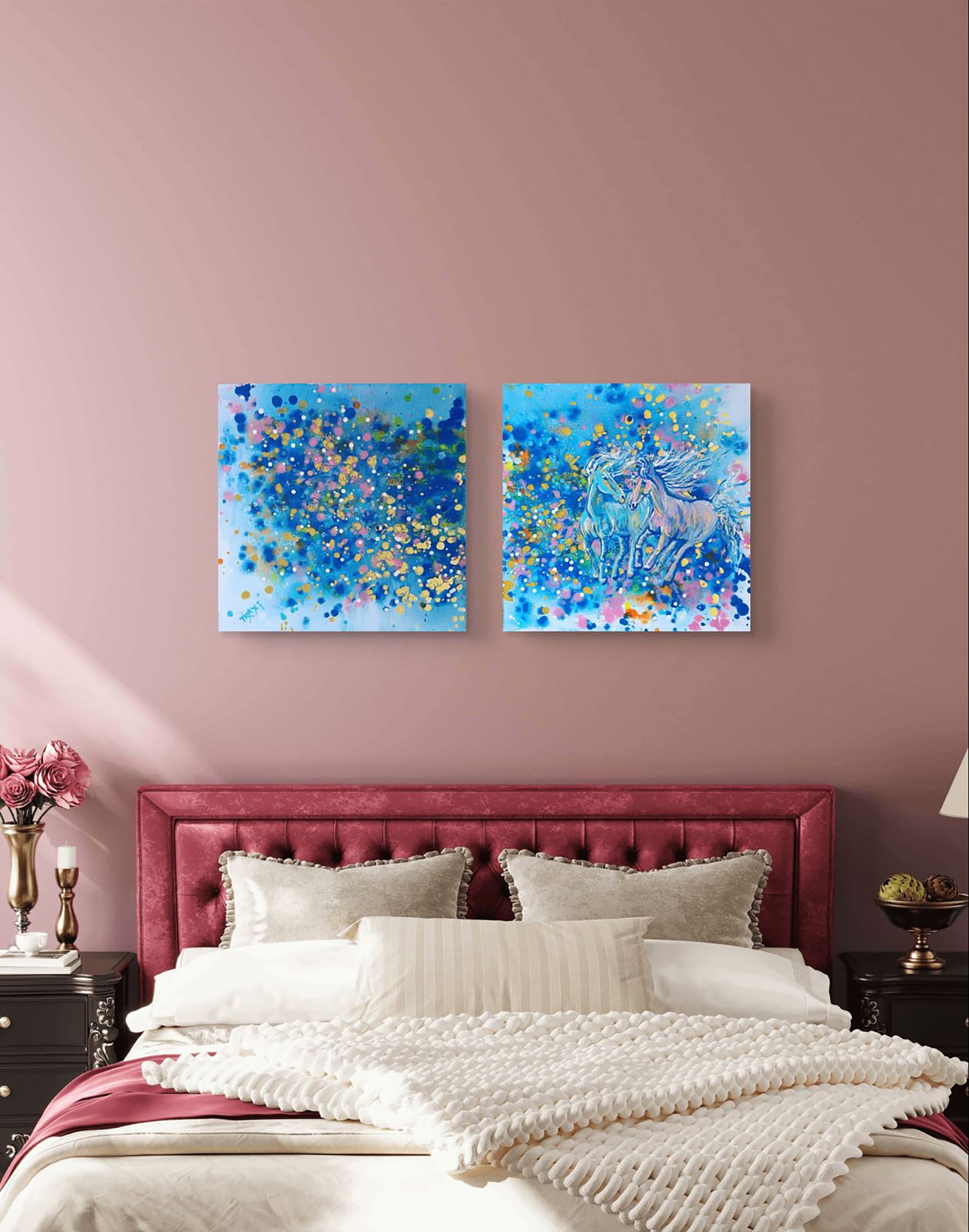 Two souls, two horses, one dream. This captivating limited edition diptych embodies love, freedom, and harmony. A pink and a blue horse gallop together across a starlit sky, symbolizing connection, trust, and shared dreams.