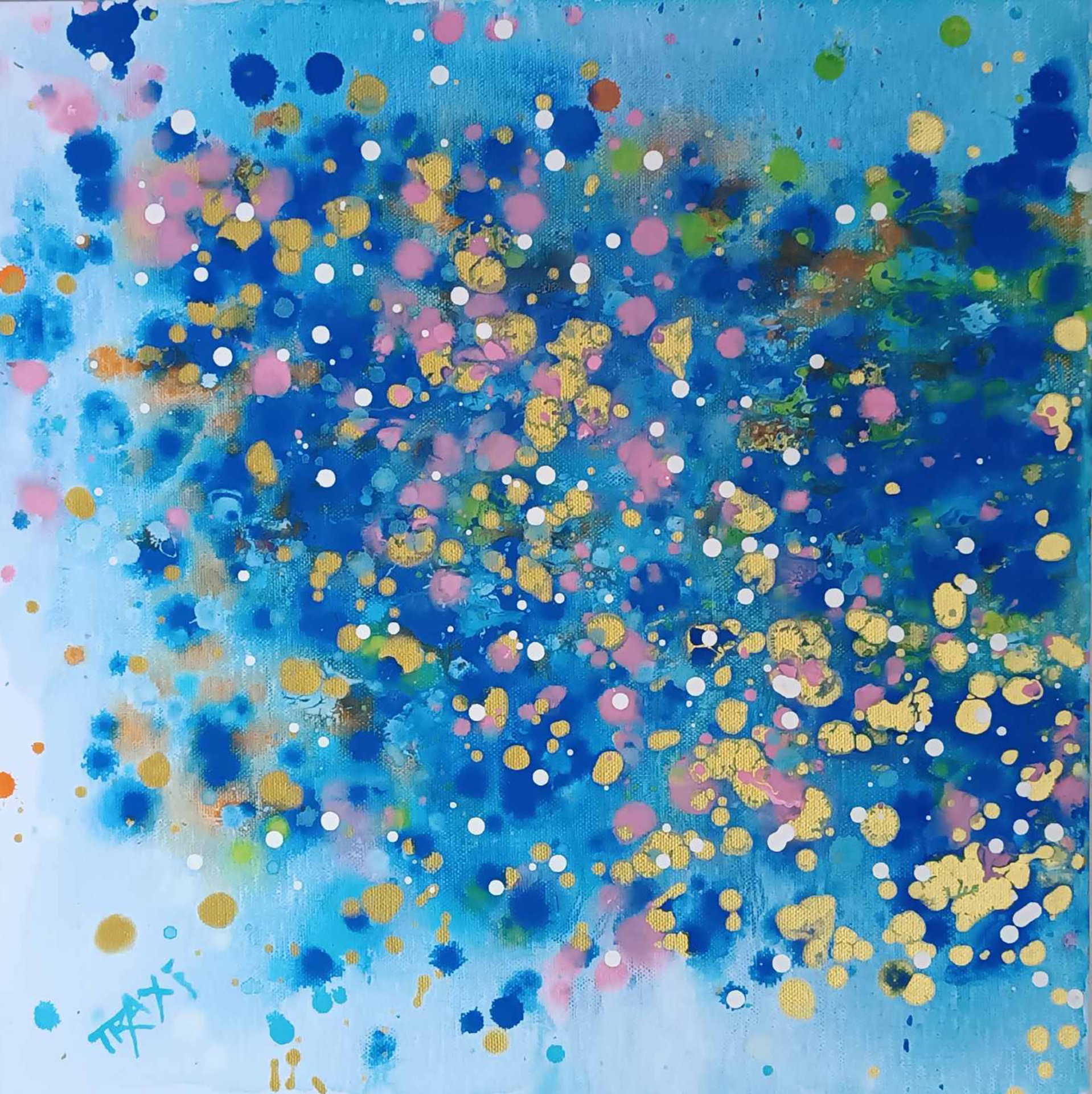 The artwork features soft shades of blue, pink, white, and gold that bring warmth and serenity into any home. The abstract expressionism style adds depth and emotion.
