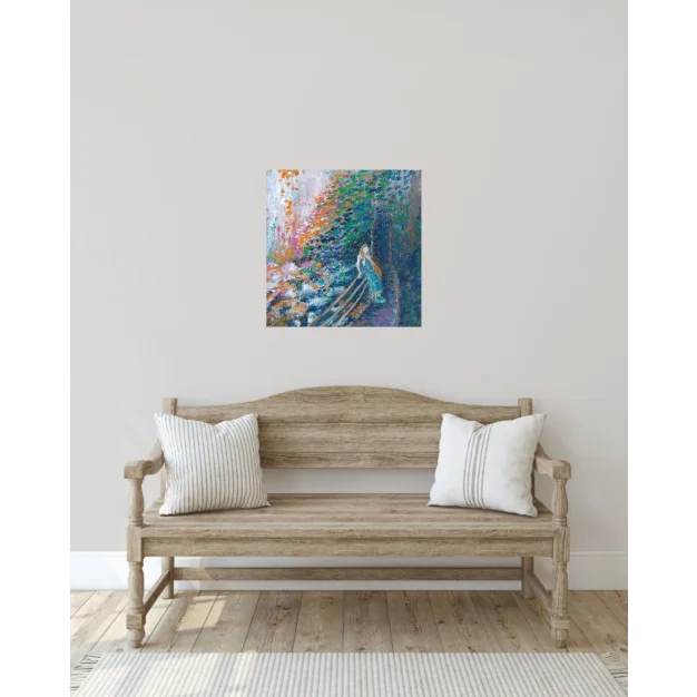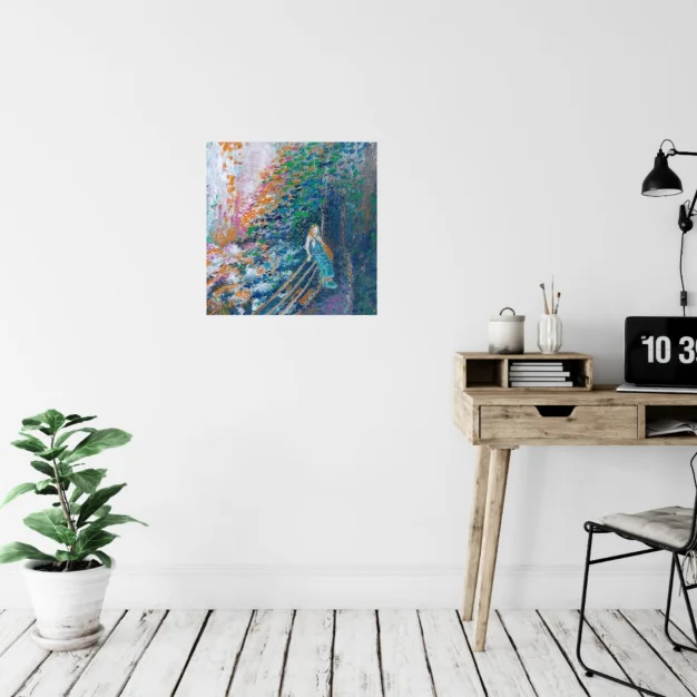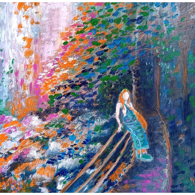 Dreamy Pathway is an enchanting oil painting that captures a woman with vibrant orange hair in a flowing blue dress, standing confidently on a rope bridge along a secluded eco-trail. With lush trees and a sparkling river below, the bold brushstrokes and rich color palette of oranges, pinks, greens, and purples create an inviting scene of nature’s beauty. Inspired by impressionist techniques and filled with vivid colors, this textured canvas captures a serene moment in nature, filled with light, shadow, and wonder. This artwork will add an uplifting and whimsical touch to any space, blending the beauty of landscape and human connection in an artful harmony.
