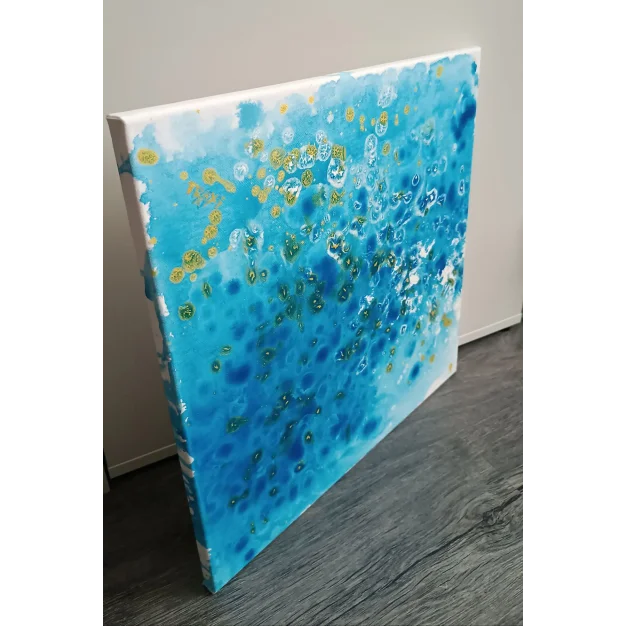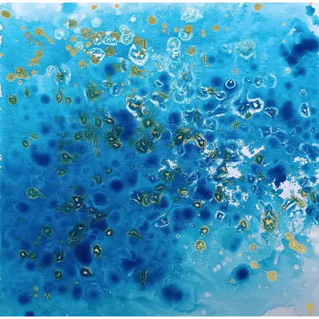 This artwork began as a vision of tranquil sea waters, transformed into a vivid abstract painting that evokes both serenity and magic. The painting process involved layering rich, translucent blues with shimmering golds, creating a piece that glows with an otherworldly charm.