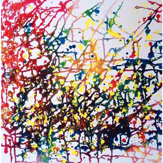 Delicate, dark lines form intricate networks, suggesting both structure and spontaneity. Textural shifts between glossy and matte surfaces add dimension and invite exploration. Small splatters and dots give the piece a playful energy, while hidden tones of maroon and purple reward viewers with rich depth upon closer inspection. This artwork is a dynamic fusion of passion and intention — a perfect statement piece for contemporary spaces.