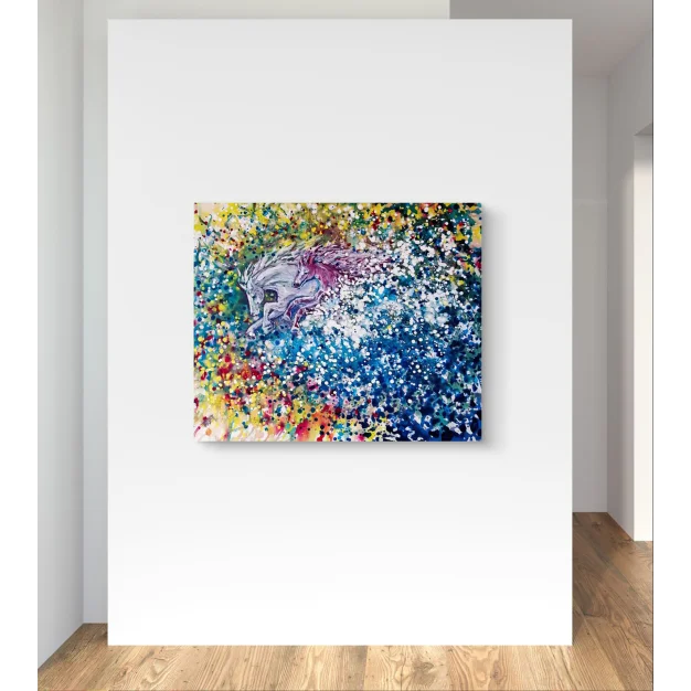 Freedom in Color: Abstract Horse in the Sky captures the mesmerizing beauty of a horse galloping through vibrant, colorful clouds, reminiscent of a spiraling nebula. This stunning acrylic painting blends detailed brushwork with an abstract, dreamy atmosphere, evoking a sense of movement, freedom, and connection to the cosmos. The artwork portrays twin souls of white and silver horses flying through the air, embodying the spirit of freedom and the warmth of summer.