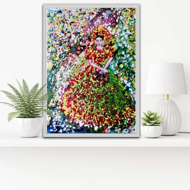 This exquisite acrylic painting is a celebration of femininity, nature, and renewal. A woman adorned in a colorful dress made entirely of flowers and berries stands as a symbol of the goddess of spring, radiating beauty and warmth. Inspired by the bold, passionate style of Frida Kahlo, this piece embodies the strength, resilience, and softness that define the essence of womanhood.