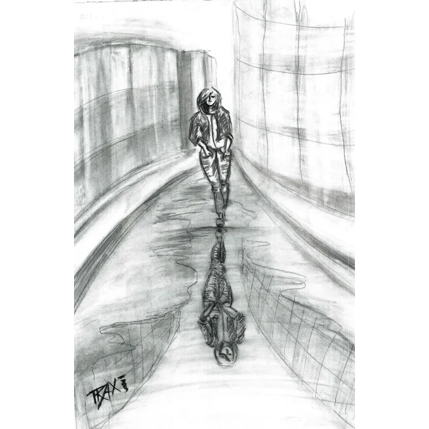 Description: This striking black and white sketch captures a surreal, dreamlike scene of a man walking down a deserted street, merging elements of conceptual horror and neo-noir art. The figure evokes a sense of eerie mystery, as if stepping out of a lucid dream or exploring an unsettling world.