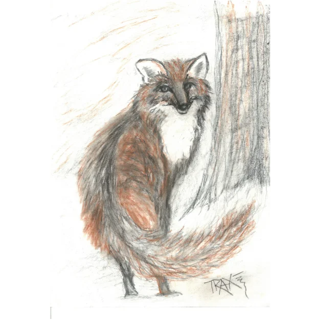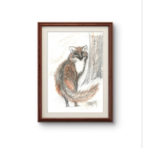 Original Fox Portrait is an evocative charcoal and mixed-media drawing that merges animal symbolism with introspective self-reflection. A striking fox stands at the forefront, its body turned mid-motion, as if reacting to something unseen. Rendered in rich reddish-brown tones with accents of white and gray, the fox's detailed fur texture and intense black eyes capture a moment filled with quiet alertness and emotional depth.