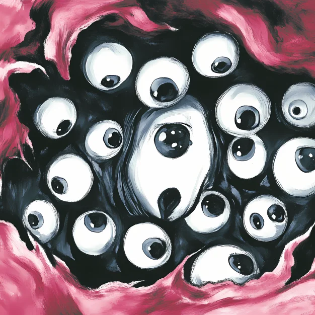 The artwork evokes a mix of curiosity and unease, drawing viewers into its mysterious and surreal world. The intense gazes suggest themes of surveillance, awareness, and introspection, making it both visually and emotionally compelling.