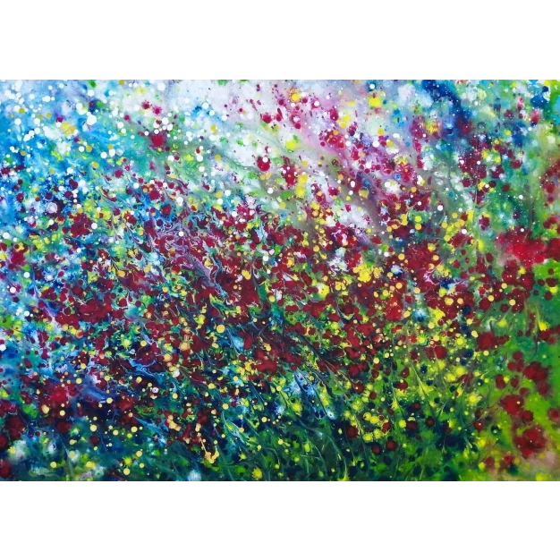 An original large abstract painting that recreates the energy and vitality of red, green and yellow wildflowers in full bloom. Inspired by the dynamic style of Jackson Pollock, the work combines pointillism and expressive brushstrokes to convey a sense of freedom, movement and summer freshness. The gaze is lost in a field of color that comes to life in the living room, office or art space.