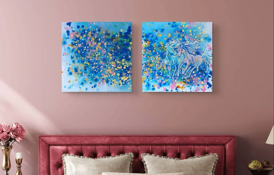 Dream for Two, limited edition art, abstract diptych, love painting, new home gift, wedding gift, couple art, romantic wall art, horse painting, symbolic art, acrylic on canvas, Traxi Art, Diana Dimova, art for bedroom, pastel art, spiritual art, contemporary artist, home decor, meaningful gift, art with soul, Bulgarian artist, handmade painting, collectible art
