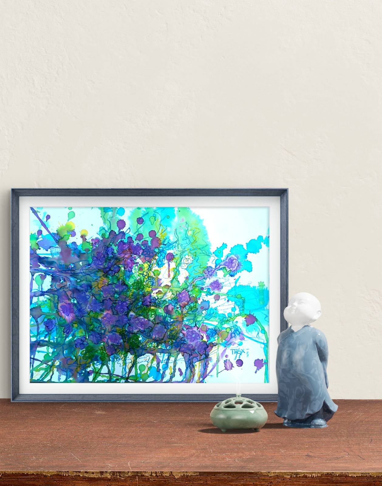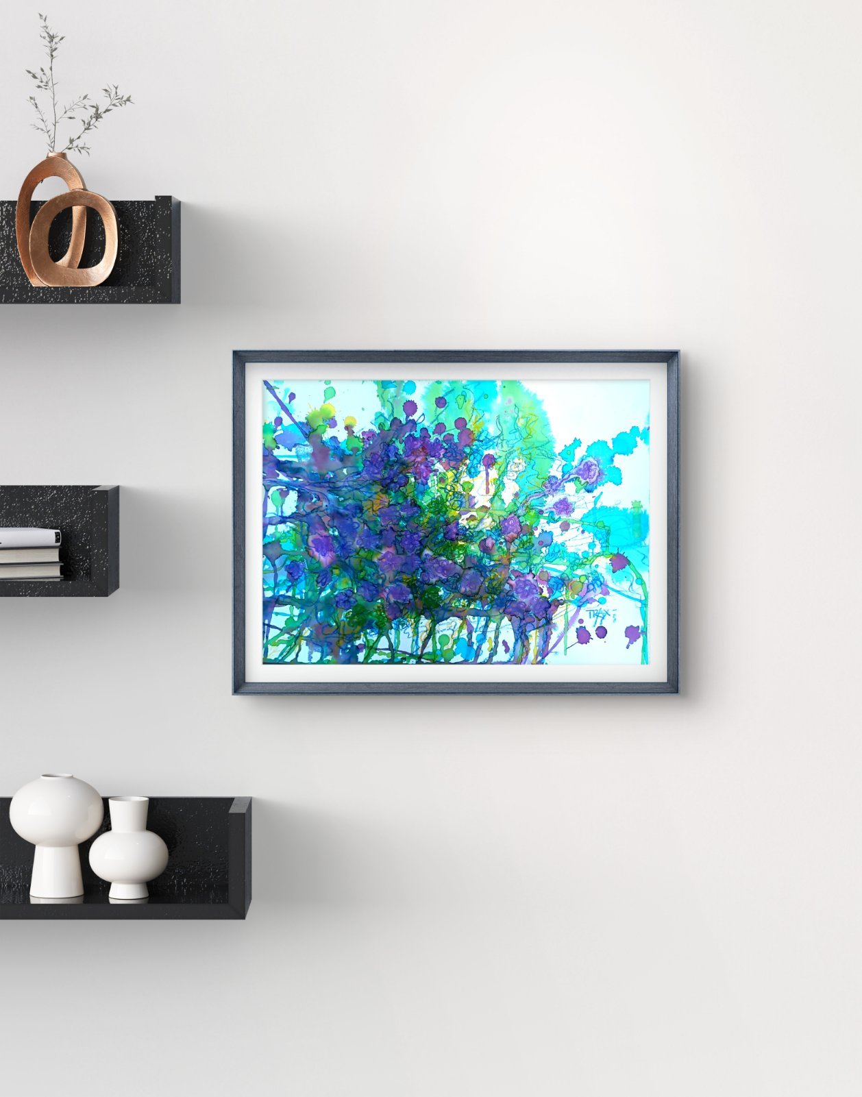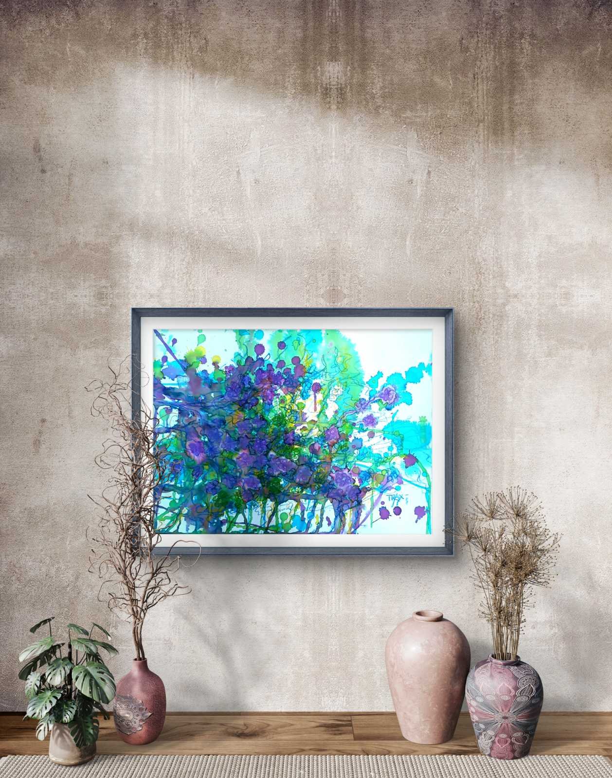Experience the vibrant energy of spring with this captivating abstract floral painting. Bursting with life, the artwork features a dynamic arrangement of purple blossoms accented by bright turquoise, green, and yellow hues. The flowing watercolor textures add depth and movement, creating a visually stunning piece of modern wall art.