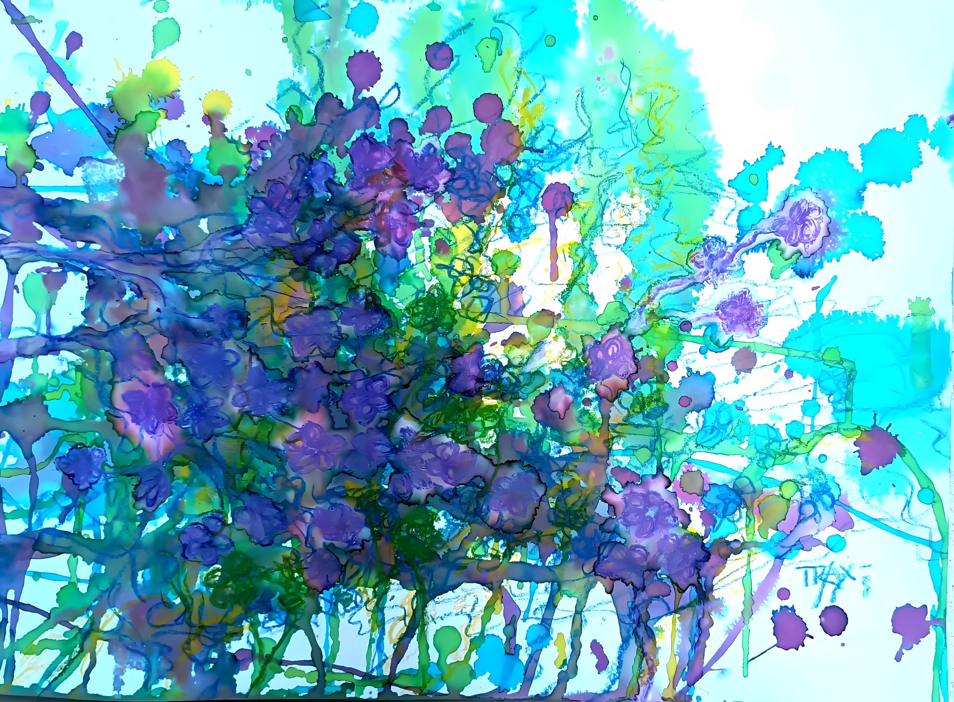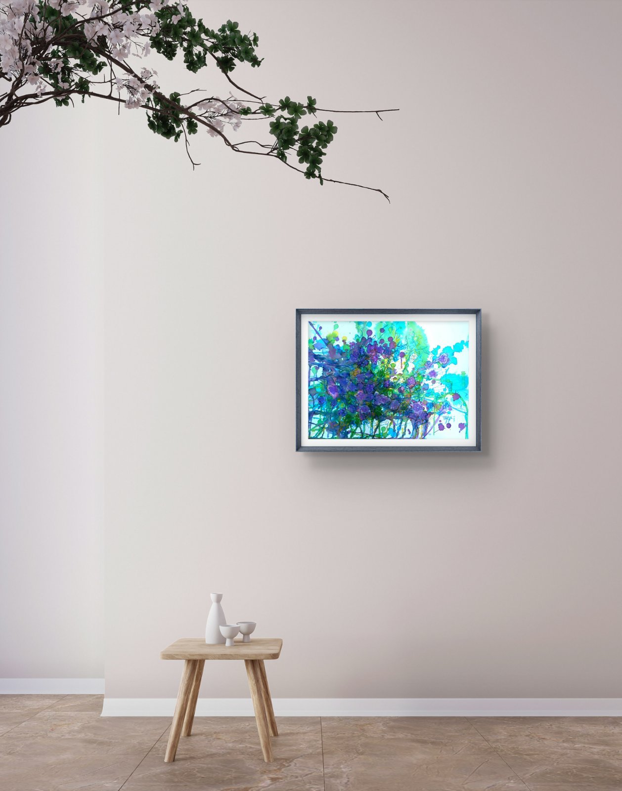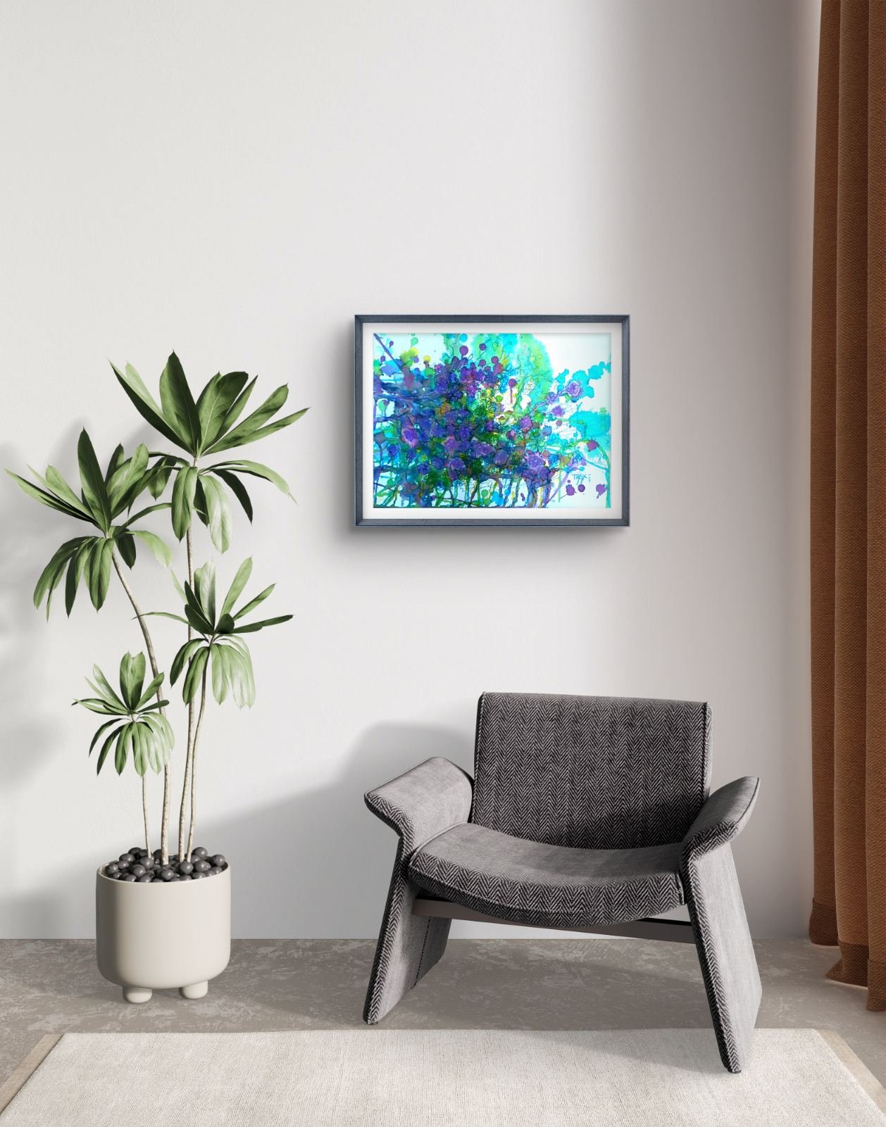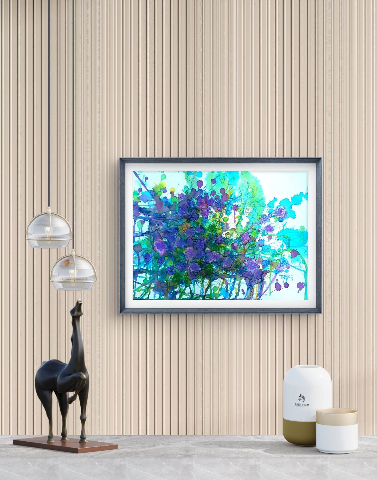 Experience the vibrant energy of spring with this captivating abstract floral painting. Bursting with life, the artwork features a dynamic arrangement of purple blossoms accented by bright turquoise, green, and yellow hues. The flowing watercolor textures add depth and movement, creating a visually stunning piece of modern wall art.
