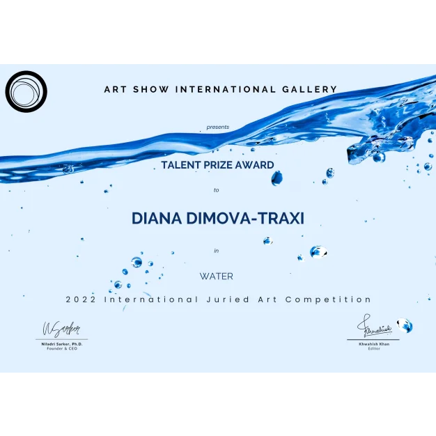 Premios: La pintura recibió el PREMIO TALENTO en la 3ª competencia de arte de agua de ART SHOW INTERNATIONAL GALLERY el 5 de enero de 2023.