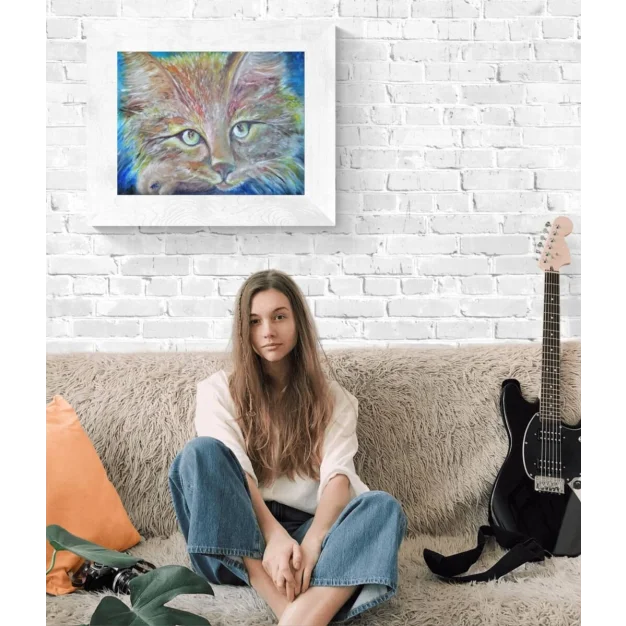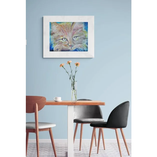 Este encantador retrato al óleo presenta un gato caprichoso con pelo colorido, situado contra un sereno fondo azul. Los intrincados detalles del pelaje y los ojos expresivos del gato están bellamente capturados en esta obra de arte única. Enmarcado y listo para exhibirse, esta pieza añadirá un toque de encanto felino a cualquier habitación de su hogar. Perfecto para amantes de los gatos y entusiastas del arte, esta pintura única seguramente será una adición encantadora y llamativa a su colección.