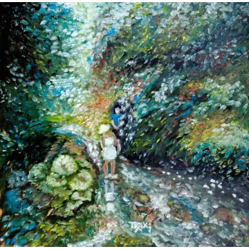 Nature's Tranquility: Impressionism Waterfall Landscape with Light between Trees - Small Size, Original Oil Painting, Unique Gift Idea