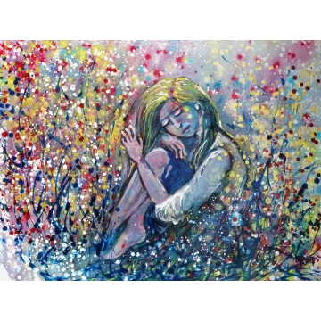 Colorful Harmony: Woman with a Flower amidst Swirling Colors Watercolor Art