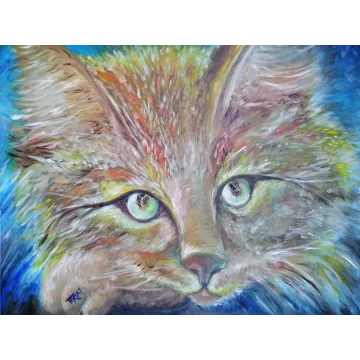 Colorful Hair Cat Oil Portrait on Blue Background - Framed Artwork