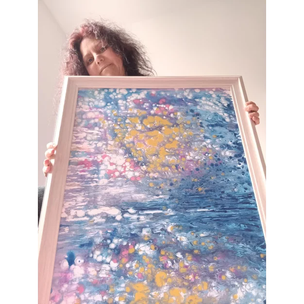 Quest'opera unica è sicura di essere un argomento di conversazione. Che sia esposta in un soggiorno, in una camera da letto o in un ufficio, questo astratto in blu, rosa e oro è un'aggiunta straordinaria a qualsiasi collezione d'arte.