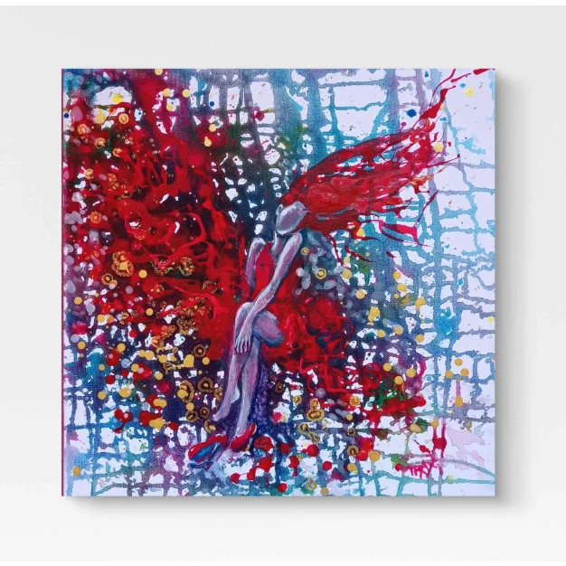 Ispirata dal ricco e evocativo colore rosso, ho versato colori acrilici sulla tela, trasformandola in un bellissimo vestito rosso, che poi richiedeva tacchi alti rossi. Così, "Bloody Mary" ha preso vita, sorridendomi. Questo pezzo è stato creato per trasmettere un messaggio di relax e gioia: dopo una lunga giornata, concediti un cocktail e brinda all'energia vibrante di quest'opera d'arte.