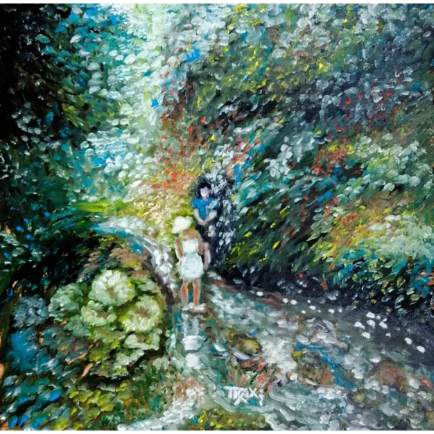 Vicino al Fiume cattura un momento tenero tra una giovane ragazza e un ragazzo circondati da una vegetazione lussureggiante e vibrante e fiori colorati. Dipinta in uno stile impressionista ispirato a Claude Monet, l'opera dà vita all'estate con tonalità morbide e calde e una luce delicata che filtra attraverso gli alberi, proiettando motivi giocosi sui loro volti. La ragazza, vestita con un vestito bianco e un cappello da sole, immerge le mani nel ruscello mentre il ragazzo rimane vicino, entrambi immersi nella bellezza del momento. Realizzata con spesse pennellate e un lavoro espressivo con coltello da paletta, questa pittura ad olio invita gli spettatori in una scena da sogno e soleggiata che celebra la gioia e l'innocenza dell'infanzia.