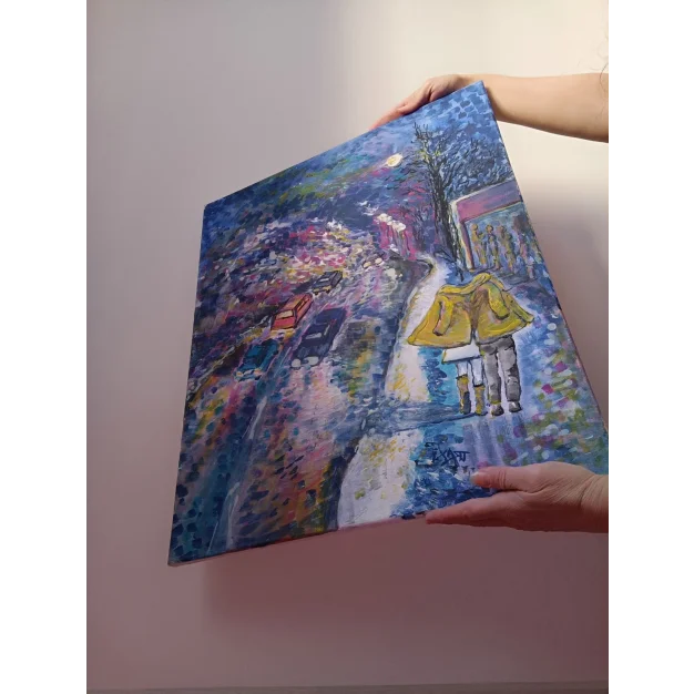 Questa straordinaria opera d'arte impressionista cattura l'essenza di un bellissimo paesaggio urbano. Rappresenta una scena romantica di due amanti che passeggiano lungo il marciapiede della città notturna. La luna illumina dolcemente il cielo, mentre i fari delle auto in transito proiettano un bagliore ipnotico sul pavimento. Un tocco di neve adorna i bordi del boulevard, e in lontananza, le persone aspettano pazientemente alla fermata dell'autobus. Al centro della composizione, due amanti trovano conforto sotto il riparo di un cappotto spiegato, le loro impronte visibili nella neve mentre si abbracciano. Questa immagine è un'incarnazione visiva dell'amore e racconta una storia avvincente che risuona con chiunque la osservi.