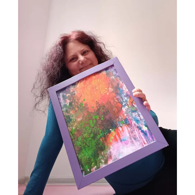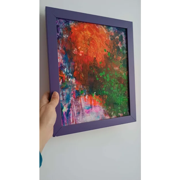 Lasciati trasportare verso un tranquillo tramonto serale su un lago mentre ammiri quest'opera d'arte magnifica. Un enorme sole rosso-arancione scende graziosamente su un lago calmo, proiettando la sua calda luce sulle acque tranquille. Forme astratte danzano sulla tela, rappresentando la bellezza di un sole al tramonto riflesso nell'abbraccio di tonalità d'acqua viola scuro. Verdi gioiosi e vibranti evocano pensieri di piante lussureggianti, aumentando ulteriormente l'appeal di questo pezzo. Permettiti di essere trasportato verso un tramonto romantico sull'acqua dove la natura lavora la sua magia silenziosamente e senza sforzo. Decora il tuo spazio con questa pittura ipnotizzante e immergiti nella pace che porta.