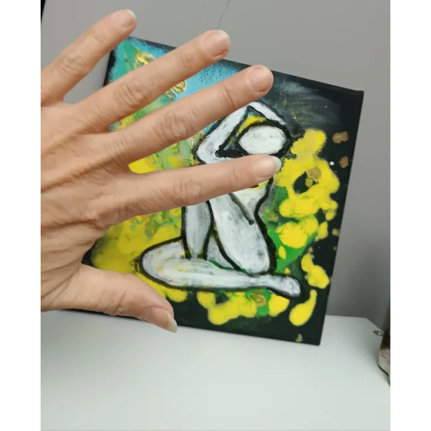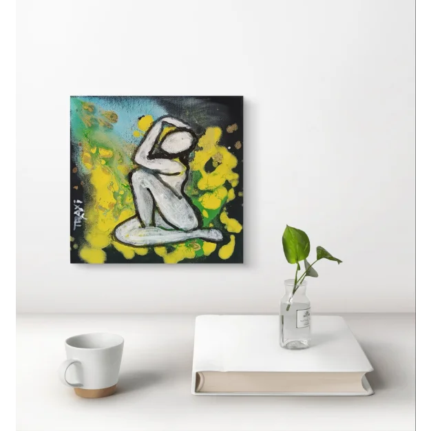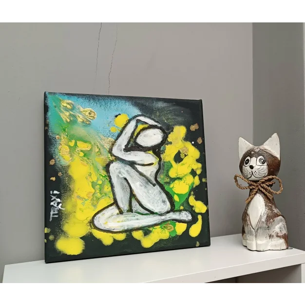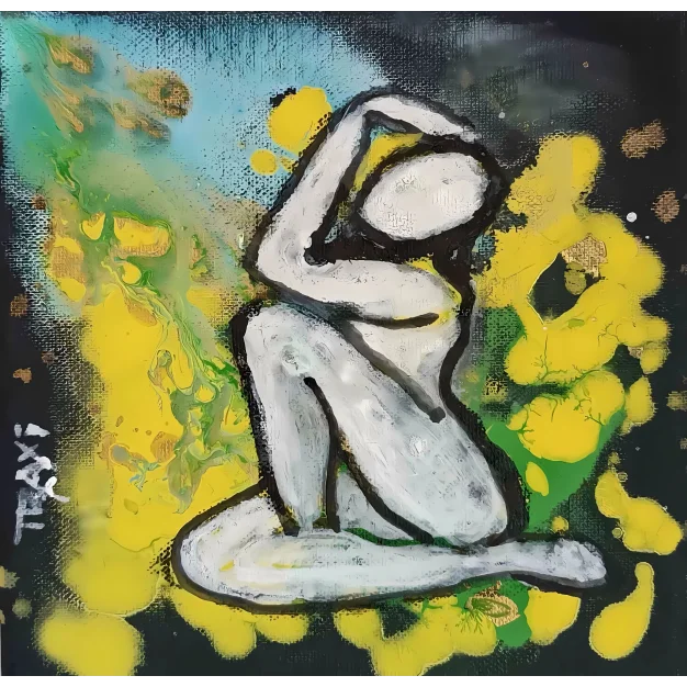 Questo dipinto acrilico astratto ritrae una figura bianca aggraziata avvolta da un turbine di colori. Le linee fluide del corpo creano un senso di movimento e profondità emotiva, mentre gli schizzi gialli e verdi circostanti forniscono un contrasto di energia e vivacità. Le braccia della figura sollevate dietro la testa suggeriscono una profonda contemplazione, mentre il spesso contorno nero aggiunge definizione e intensità. Le pennellate espressive sullo sfondo aggiungono texture e un senso di spontaneità, rendendo quest'opera d'arte sia visivamente sorprendente che emotivamente risonante.