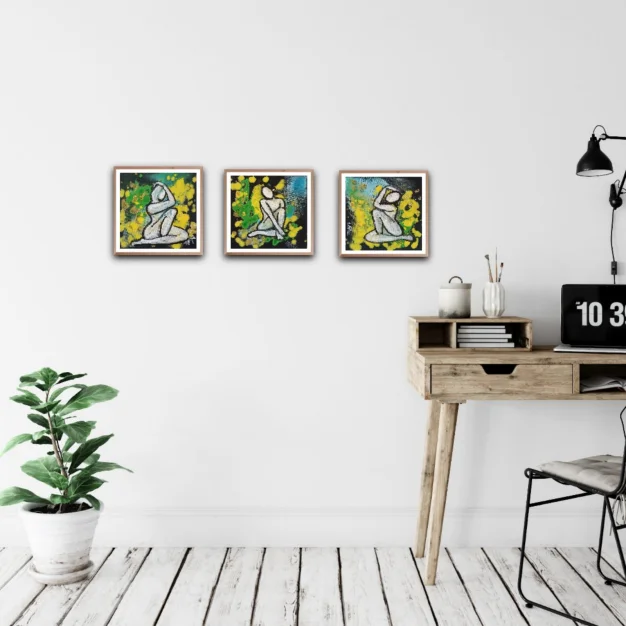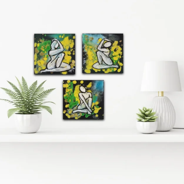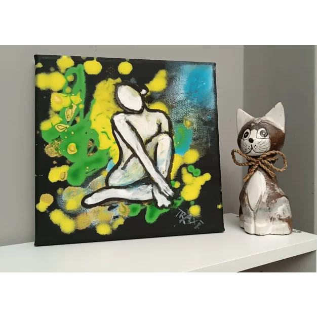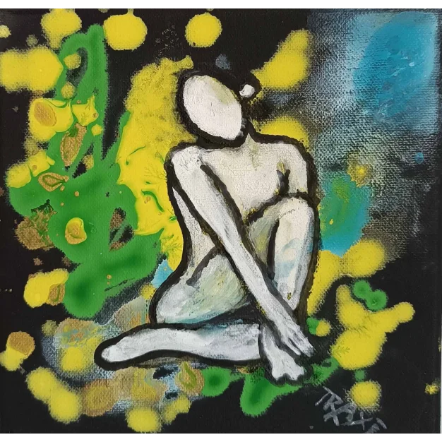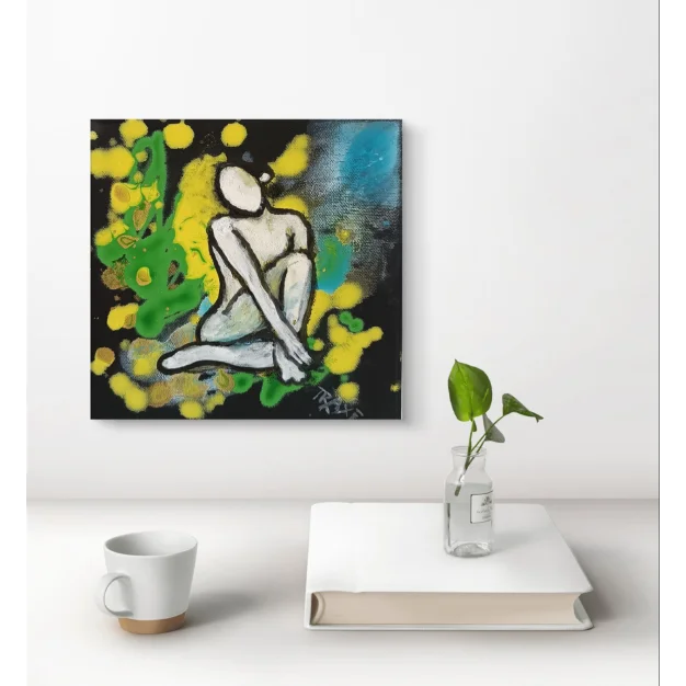 Un pezzo astratto ipnotizzante che presenta una delicata figura bianca, in un momento di riflessione e auto-riflessione. Lo sfondo vortica con vivaci tonalità gialle e verdi, creando un senso di movimento e profondità. Le linee morbide e fluide della figura si stagliano contro il gioco di colori energetico, offrendo un contrasto tra serenità e dinamismo. Il spesso contorno nero esalta la forma della figura, rendendola un punto focale sorprendente all'interno della composizione espressiva.