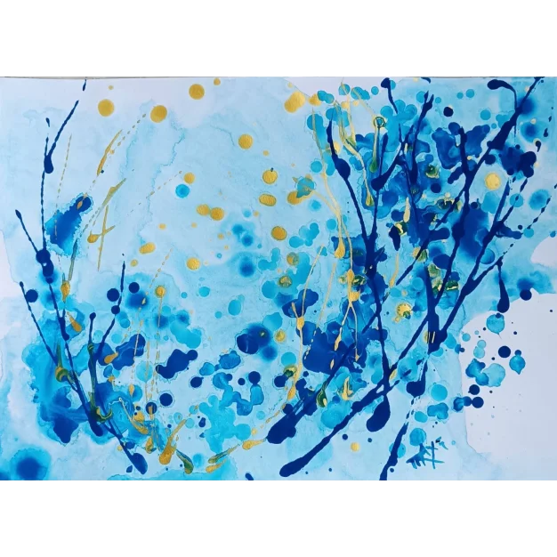 Entra in un mondo sereno di blu fluidi e oro scintillante con "Paesaggio Invernale," un'opera di pittura acrilica astratta originale su carta. Questa composizione affascinante è caratterizzata da una miscela armoniosa di blu cielo, azzurro profondo e ceruleo, evocando la fresca e tranquilla bellezza di una giornata invernale.