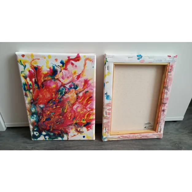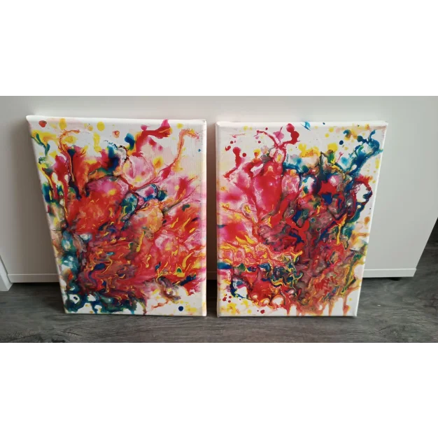 Gjennom dristige røde toner og dynamiske akryllag utforsker maleriet lidenskap, bevegelse og følelsesmessig intensitet, og forvandler farge til et visuelt språk av energi og uttrykk.