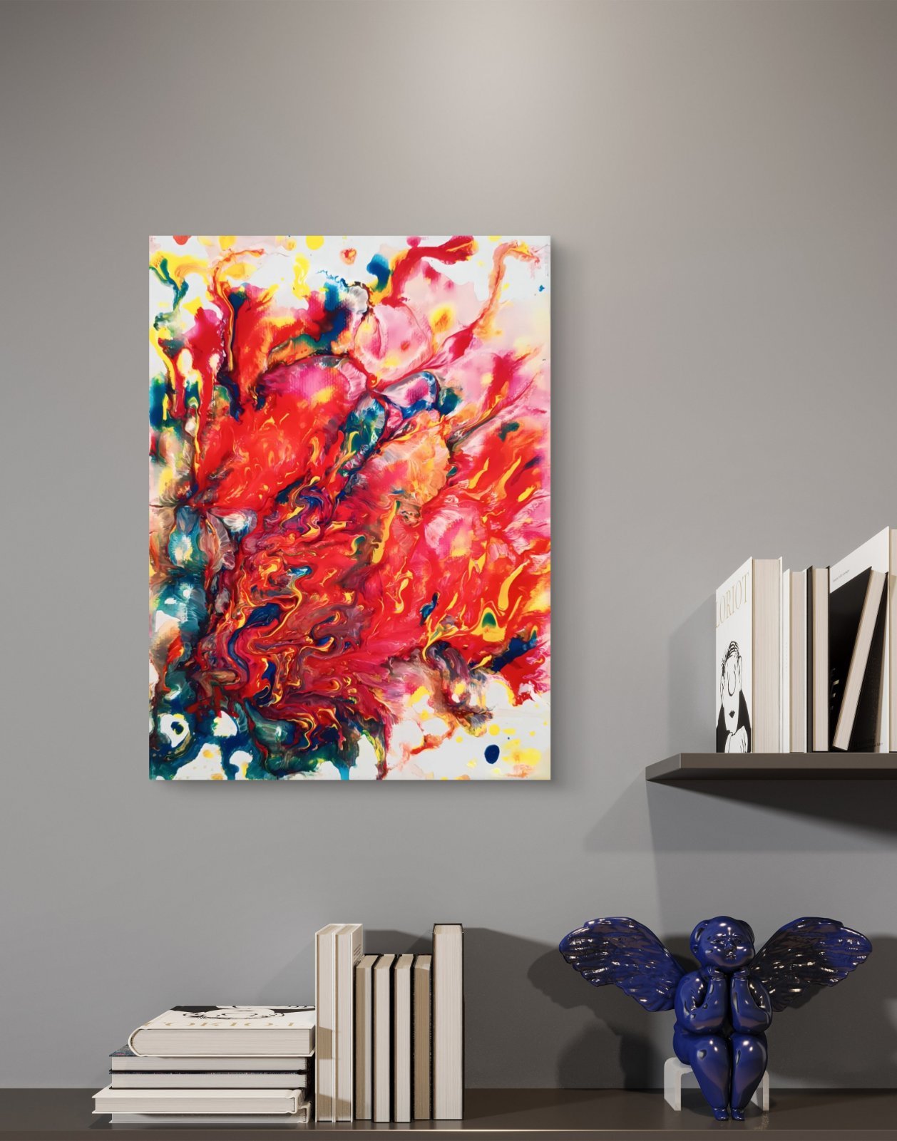 Poprzez odważne czerwone odcienie i dynamiczne warstwy akrylowe, obraz bada pasję, ruch i emocjonalną intensywność, przekształcając kolor w wizualny język energii i ekspresji.